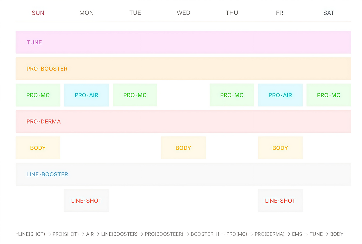Absorb a light serum and ampoule in booster mode, then follow with a rich, viscous cream/gel formulation. After booster mode care, use mc mode and derma shot mode with the remaining amount on the skin without applying additional skincare. If the intensity feels too low, add additional product. *The above usage method is suggested for simple understanding. Find the method that suits you best while using it.
